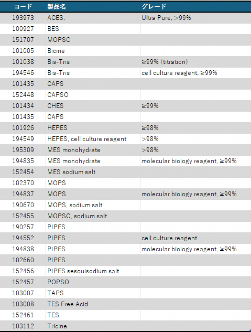 ・水に対する溶解度が高く、高濃度緩衝液の調整が可能。